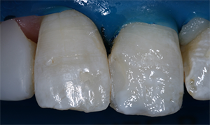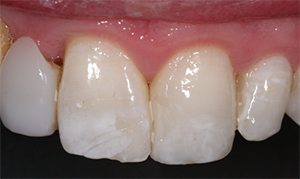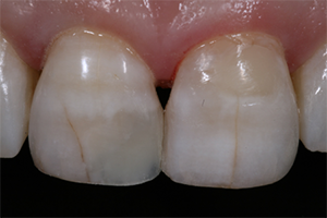 More translucent composites that blend well with surrounding tooth structure greatly simplify the process of performing anterior restorations, but they do have their limitations. If placed over a dark tooth preparation, then the underlying tooth structure is more likely to discolor a translucent composite. Also, when translucent composites are used for Class IV restorations in which the lingual wall is absent, the darkness of the oral cavity will manifest as a greying of the restoration (Fig. 3). For these “through and through” Class IV preparations, it is beneficial to use a composite to mimic the opacity of dentin. Several composite systems offer different translucencies of composite. For example, the Filtek Supreme Ultra system offers a dentin shade that is about 60-percent more opaque than the body shade and an enamel shade that is about 30 percent more translucent than the body shade (Fig. 2).6 These dentin and enamel shades can be used to very closely match the natural tooth structure, but it requires a significant amount of experience to correctly achieve the desired effect (Figs. 4-7)