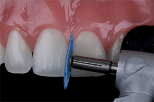 The other commonly used tools for finishing and polishing anterior composites are flexible polishing discs (i.e. Sof-Lex Contouring and Polishing Discs, 3M ESPE; FlexiDisc, Cosmedent). These contain aluminum oxide particles of different sizes ranging from 5 microns (super fine) to 14 microns (fine) to 29 microns (medium) to 100 microns (coarse). The medium and coarse discs can finish and recontour the restoration. Several studies have compared the polish achieved with flexible polishing discs to the polishing points, with some studies showing an advantage with the points10 and others with the discs.11 Practically, the advantage of polishing discs in anterior restorations is that these discs are flexible and will often help to create smooth contours of the restoration. They can also adapt to embrasure spaces (Fig. 11).