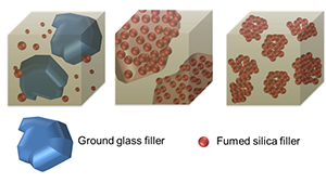 The next concept in composites was the development of a composite entirely filled with small 40 nm silica particles to take advantage of the polish that can be obtained with small filler particles. To explain this, think of looking out of the window of an airplane. You would not be able to see a divot in the ground the size of a golf ball, but you would definitely notice a football field-sized crater. The same concept applies to filler size when finishing composites.