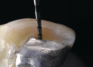 Step 1: After evaluating the soundness of the tooth, the shade is determined prior to any preparation (in this case, the shade was A2), add retentive features within the amalgam and ensure the presence of an enamel bond. In order to optimize the bond of the composite to the amalgam, retentive features may be added through mechanical or interlocking grooves, roughening the surface with a diamond bur, or sandblasting the area to be restored (Figs. 1-3).