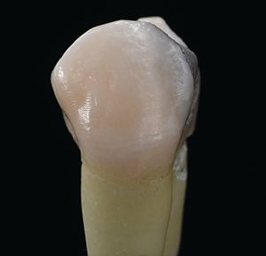 However, when the proper layer of opaquer is applied, the final result is a highly esthetic restoration that properly covers the underlying dark substrate and mimics the brightness and vitality of natural tooth structure.