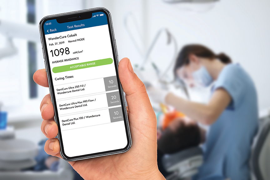 Once all lights and materials are selected, you hold the light against the port on the device and turn on the light. The device will quickly determine the light output of your light in precise mw/cm2 readings. However, the science doesn’t end there. The app also evaluates what composite you’re using and offers curing times for each brand of composite as well as times for each shade! This means in a few short seconds, you know exactly how strong your light is as well as how long you need to cure your restorations.