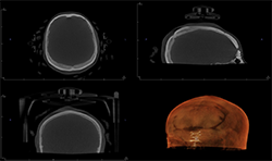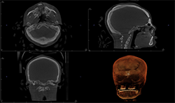 The Planmeca Viso G7 CBCT unit and Planmeca Romexis software can stitch two volume scans automatically with one click. The top portion of the skull (Fig. 7A) and the remaining maxillofacial portion (Fig. 6) were stitched to make a single skull volume (Fig. 7B). Multidisciplinary team has been working on this patient. Prosthodontics and oral surgery will plan to manage maxillary alveolar cleft and associated malocclusion following the CBCT images.