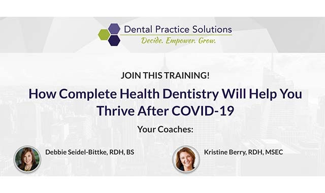 How complete health dentistry can help practices thrive after COVID-19. Debbie Seidel-Bittke, RDH, BS, and Kristine Berry RDH, MSEC, introduce complete health dentistry on-line training.