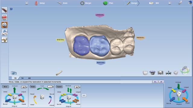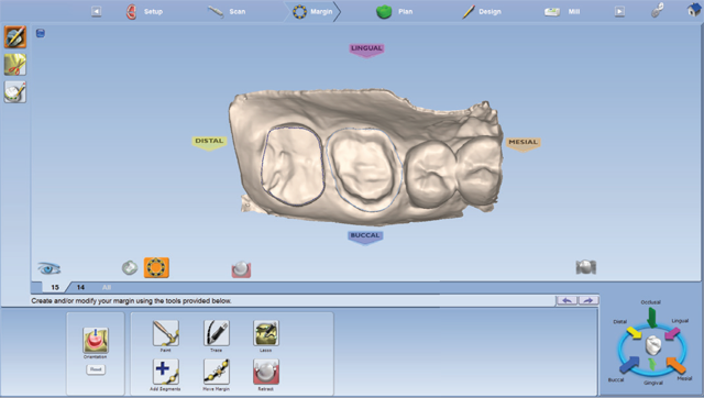 The prepared teeth and buccal bite were then scanned using the Planmeca Emerald. A detailed examination of the preparation design, including margin placement and occlusal clearance, was performed on the PlanScan system monitor. A shade was selected using the Ivoclar Vivadent e.max CAD shade guide. Once satisfied with the preparations, the margins were easily marked and the restorations were designed, taking into account necessary material thickness, contacts, embrasures and occlusion (Figs. 3 and 4). Sprue placement was verified and the designs were sent to the mill.