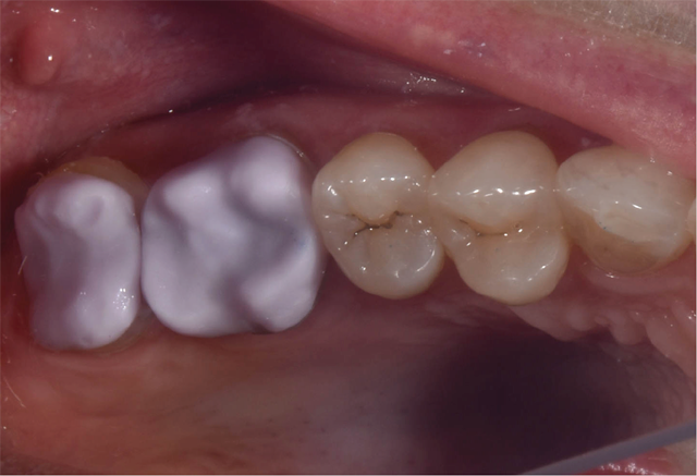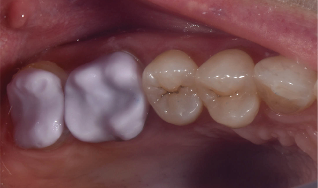 Preparation for full-coverage, all-ceramic onlays for teeth No. 14 and No. 15 was performed using an electric handpiece at 35,000 rpm under copious water irrigation. A bur block designed for all-ceramic preparations was used to achieve an ideal preparation for lithium disilicate. IPS e.max (Ivoclar Vivadent) was selected for its ideal esthetics and strength (Fig. 2).