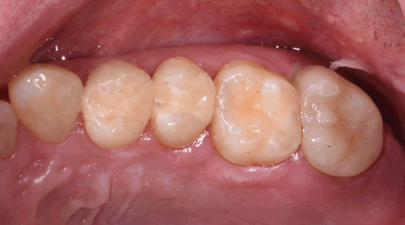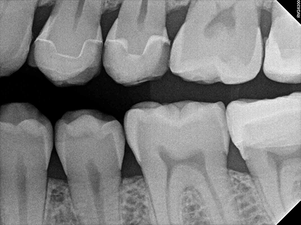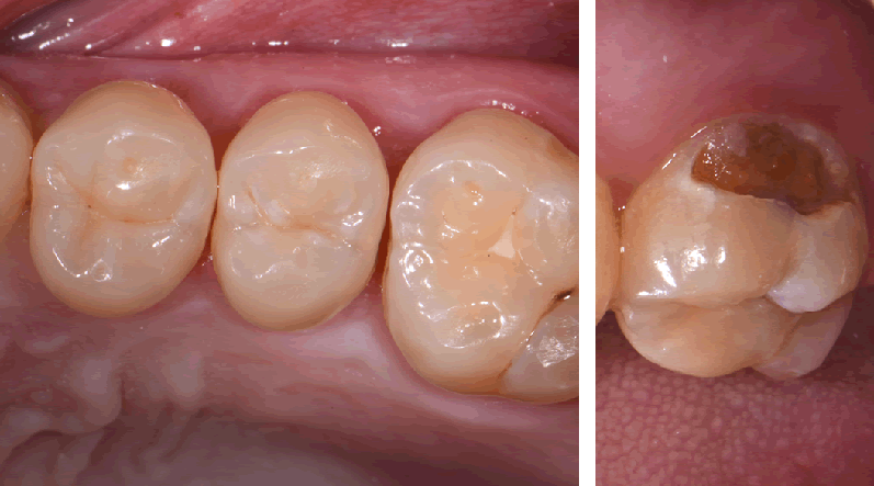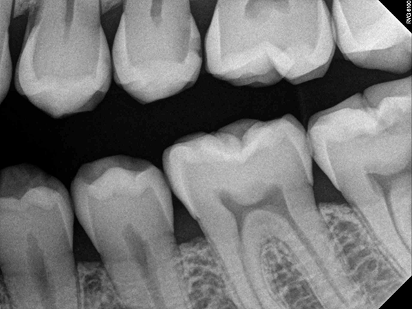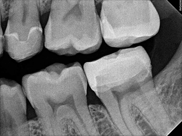 Visual examination revealed decay on the mesial marginal ridge and distal marginal ridge of tooth #13 as well as extensive buccal and occlusal decay on tooth #15 (Figs. 1-2). Bitewing radiographs and intraoral photographs were taken, which confirmed the above diagnosis and also exposed additional decay on the distal of tooth #12 (Figs. 3-4).