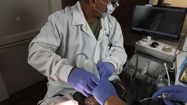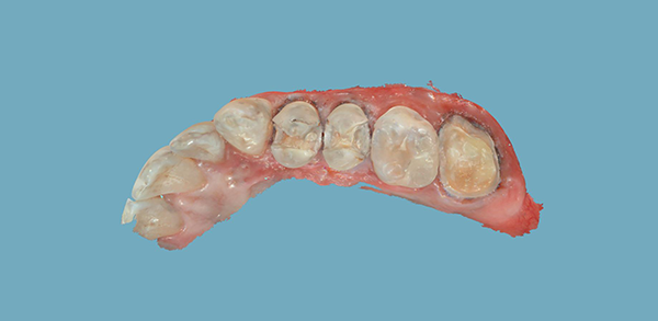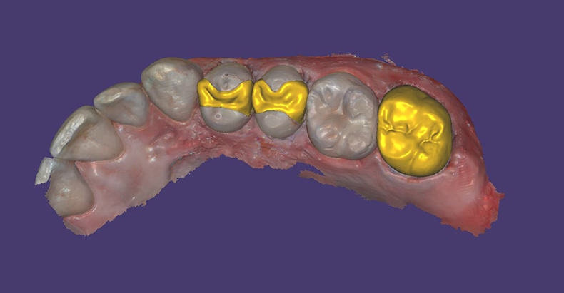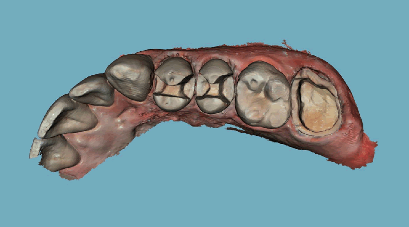 The tooth was prepped and the CS 3600 intraoral scanner was used to scan the preparation sites and surrounding dentition to create the digital model (Fig. 5). This digital model would be later used to plan the preparations in computer-aided design (CAD) software (Figs. 6-7).