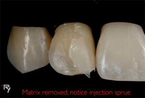 Fig. 12: The flowable is followed by heated Filtek Supreme Ultra Composite B2 injected into the flowable causing hydraulics that pushes the flowable back out of the matrix. You over injection mold with the composite, thus creating a sprue that will be cut away after curing.