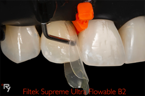 Fig. 11: A light coat of bond is brushed on the cured bond, but this isn’t cured. It will act as a surfactant for the composite. Filtek Supreme Ultra Flowable B2 is then injected into the matrix. You could heat the flowable for this step. However, I prefer it unheated, as I can control its flow better and create adequate hydraulics.