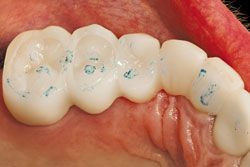The individual units are placed on the preparations with a drop of temporary cement in the occlusal or incisal areas for stability during the impression process. The Snap-On Smile implant provisional for this case extended from tooth Nos. 10 to 14 (Fig. 2).