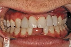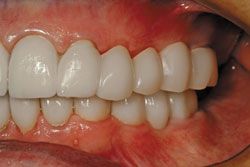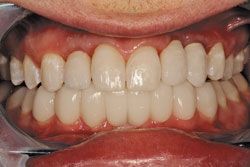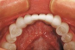 The patient in Fig. 4 had implants restored for missing teeth in the maxillary anterior area. His treatment plan included a mandible anterior bridge to restore congenitally missing central incisors. But because of budgetary constraints and an impeding wedding, the patient did not plan to have the mandibular restoration completed right away, and wasn’t sure when he’d be able to.