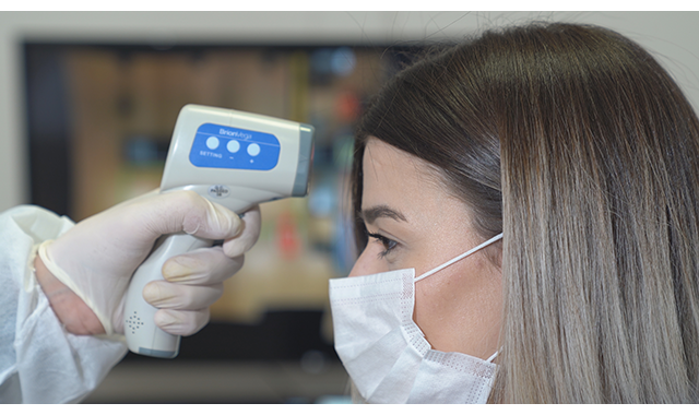 As the patient enters the office, staff will immediately take their temperature using a no-contact thermometer, while exit areas and waiting rooms will have publicly displayed hand sanitizer units.