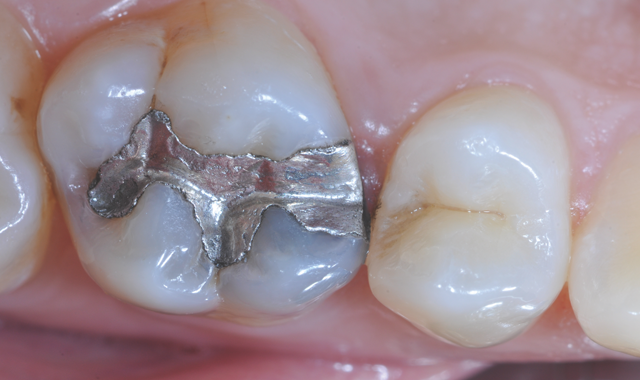 The initial situation: This case involved the replacement of an insufficient amalgam restoration of first upper molar and treatment of carious lesion on premolar. The patient was experiencing pain (Fig. 1).