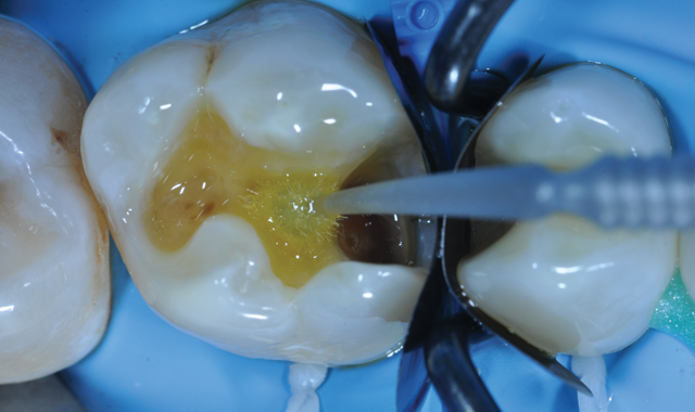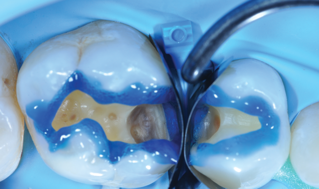 3M™ Filtek™ One Bulk Fill Restorative in shade A2 was directly placed into the cavity in a single increment and then cured according to the Instructions for Use (Fig. 5).