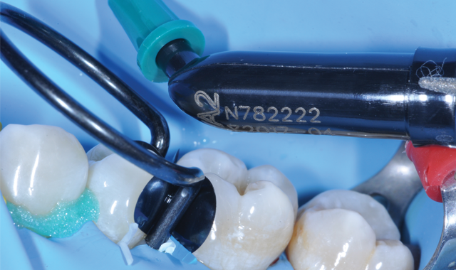 3M™ Scotchbond™ Universal Adhesive was applied and scrubbed into the surface for 20 seconds. After air drying for approximately five seconds, the adhesive was light cured for 10 seconds with 3M™ Elipar™ DeepCure-S LED Curing Light (Fig. 4).