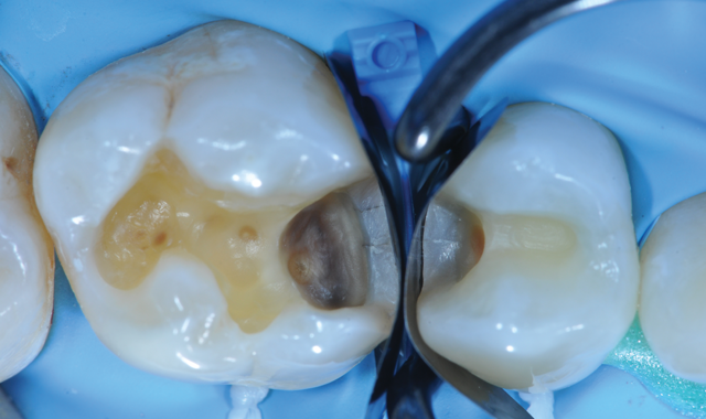 First, the amalgam and carious tissue was removed. Next, the sectional matrix was placed and adapted to the tooth (Fig. 2).