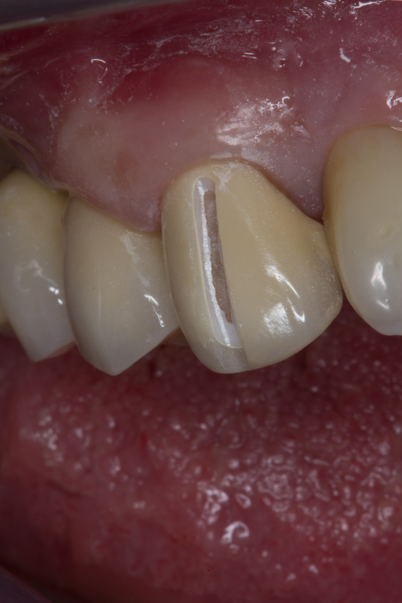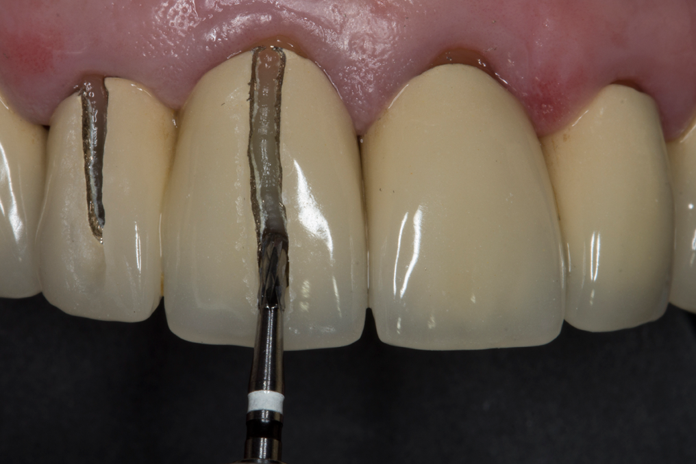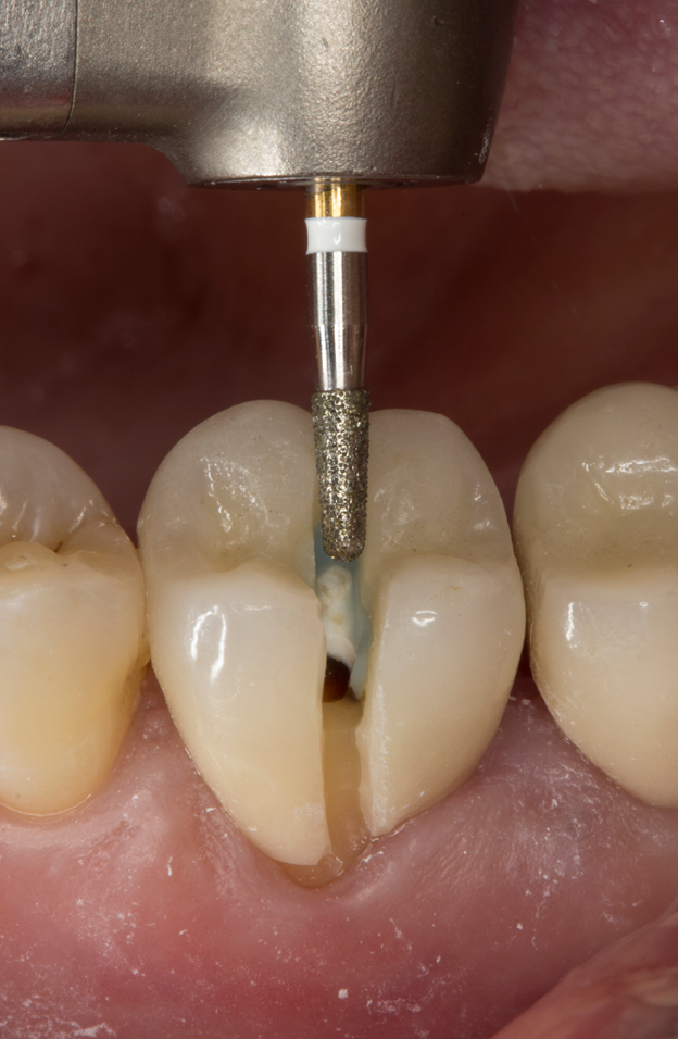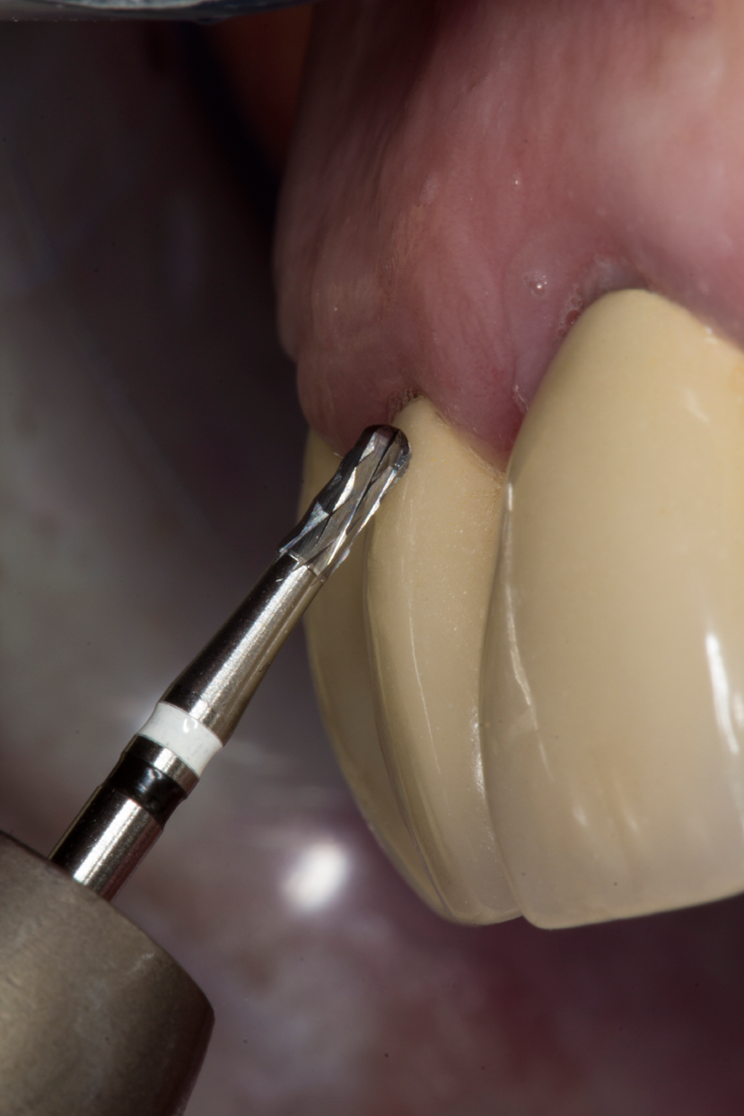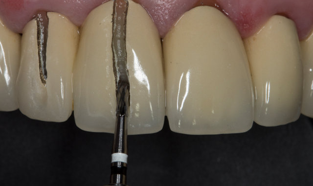 If the remaining intact lingual or palatal crown surface fails to come off, a separating slit should be cut in this area and the forceps can be used once again. Any remaining fragments can then be removed with sonic tips (SF979.000.014, Komet USA) or with an 8mm-long crown cutter for all-ceramic crowns (4ZR.FG.014, Komet USA).