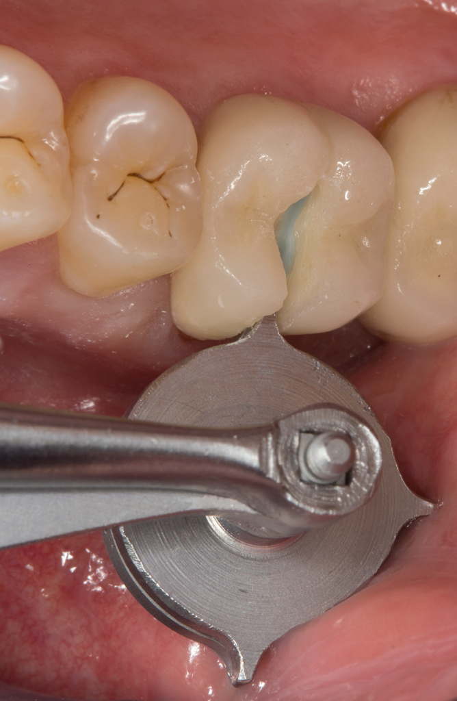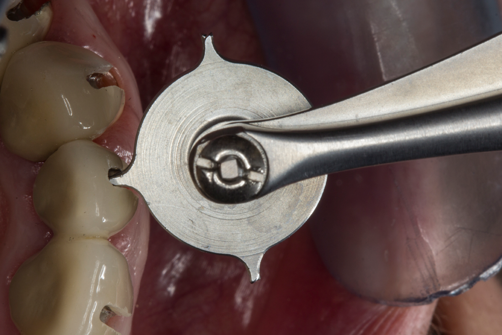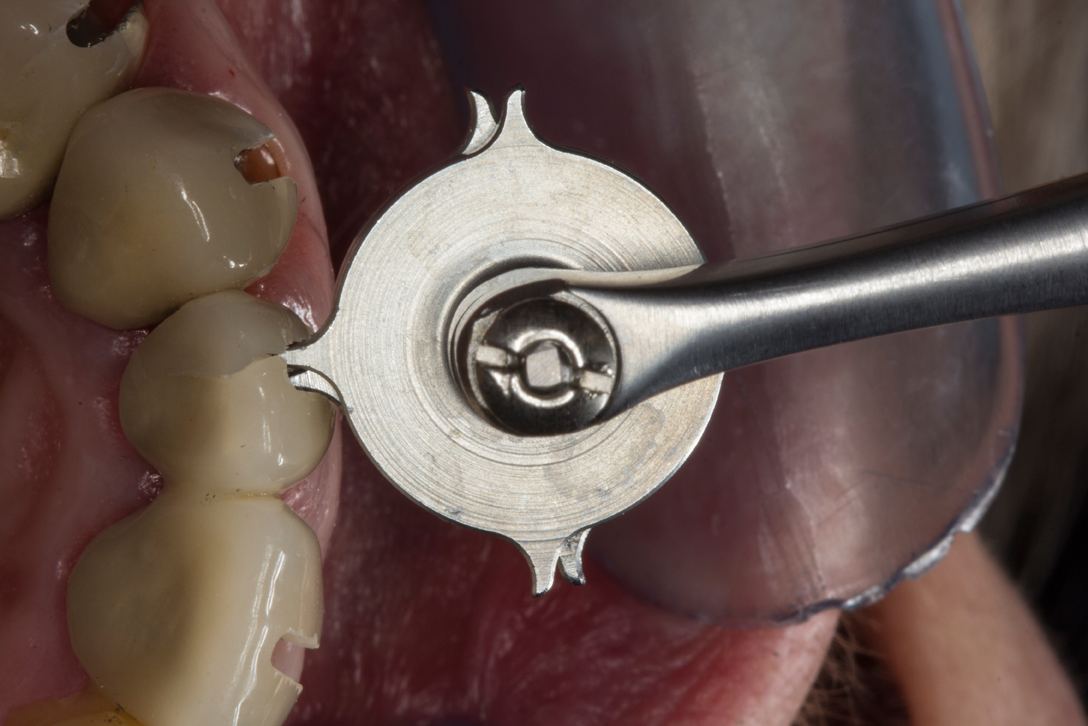 In case of traditional, cemented zirconia crowns, the crown-dilating forceps should be used only once following the opening of the restoration; this facilitates the fracture and removal of the entire restoration in the region of the remaining axial wall. For posterior crowns, both the axial wall and the occlusal surface should be opened to ensure that the restoration can be fractured with ease. Thanks to the short working end of the crown-cutter, the ideal angle can be achieved even in the posterior region (Fig. 7).