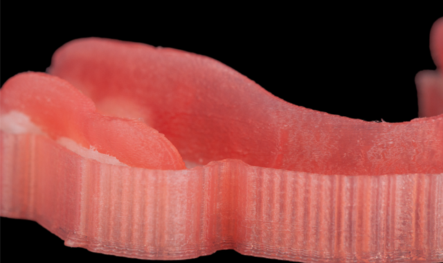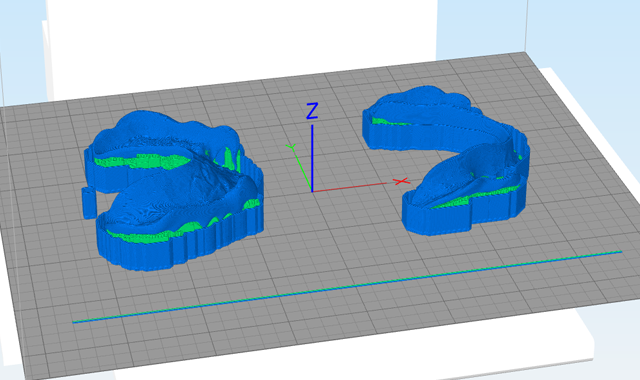 After printer and material presets are applied the 3D models and resulting toolpaths can be visualized using the cross-sectional preview in Simplify3D. The denture is printed at 100μ resolution using Valplast® 3D printing filament (Valplast Corporation). The dental models are also printed at 100μ resolution using the r.Pod® Desktop 3D Printer with Dental Model filament from Arfona, LLC.