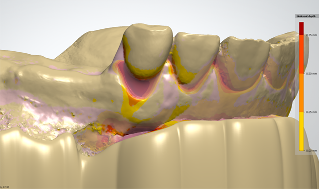 Desirable tooth and soft tissue undercuts are identified and blockout is subtracted from facial surfaces using the virtual wax knife in order to design the retentive arms. Lingual, mesial and distal undercuts are characterized as undesirable and the blockout wax will remain below the height of contour in these areas.