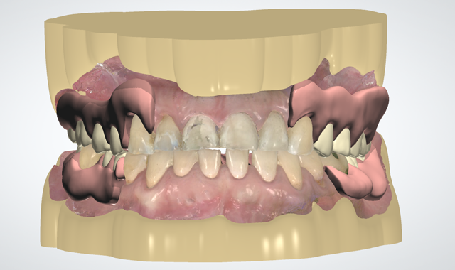 The digital impression allows for a completely mucostatic impression (mucostatic being the preferred impression technique for flexible RPDs), which will be critical to the fit of the final appliance as it is designed to be completely tissue-borne. Maxillary and mandibular arches are scanned and the order transmitted to the lab via 3Shape Communicate. Once received by the lab, the order is set up as a removable partial denture with artificial teeth for both the maxillary and mandibular arches.