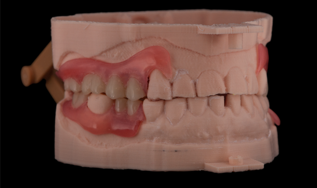 Though the target finished thickness of the denture is 1.5mm, the extra 0.5mm of thickness provides a more homogenous printing of the denture base and allows for some reduction during the finishing and polishing stages after the denture has been printed. Support bars are positioned to connect the clasps and reciprocating arms over the occlusal table to help stabilize them during printing. Wax is built up around the base of the denture teeth and into interproximal spaces. The denture base is then cut to the basal surfaces of the teeth to create tooth pockets, thus finalizing the denture design (Fig. 5). Models are designed with built-in articulator interfaces and vertical stops to position the models in occlusion after printing.