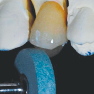 After cooling, adjustments were made to the occlusion with a large wheel to create wear facets (Fig. 14).