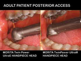 A standard sized head may contact opposing teeth, creating a stressful and uncomfortable sensation. The J. Morita TwinPower Turbine Ultra Series (UltraM and UltraE) offers a compact head design that provides excellent and reliable cutting ability with smooth, vibration-free operation. The bur can be held upright during molar preparation with the mirror placed at an angle to the handpiece head, minimizing water and debris accumulation.