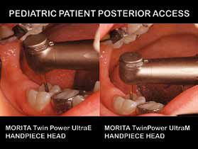 The small head size of the TwinPower Ultra handpieces offers outstanding posterior access and excellent mirror and microscope viewability. This feature is extremely important when preparing endodontic access. A standard handpiece head must be slanted to provide occlusal visibility.