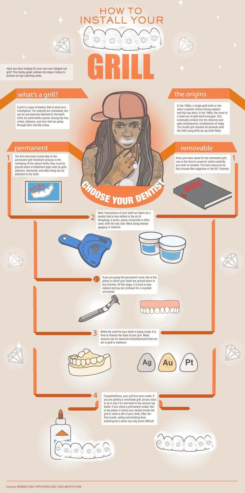Here's a handy infographic for aspiring MCs on how to properly install a grill, a flamboyant fashion accessory that might even make Liberace jealous of your mouth.