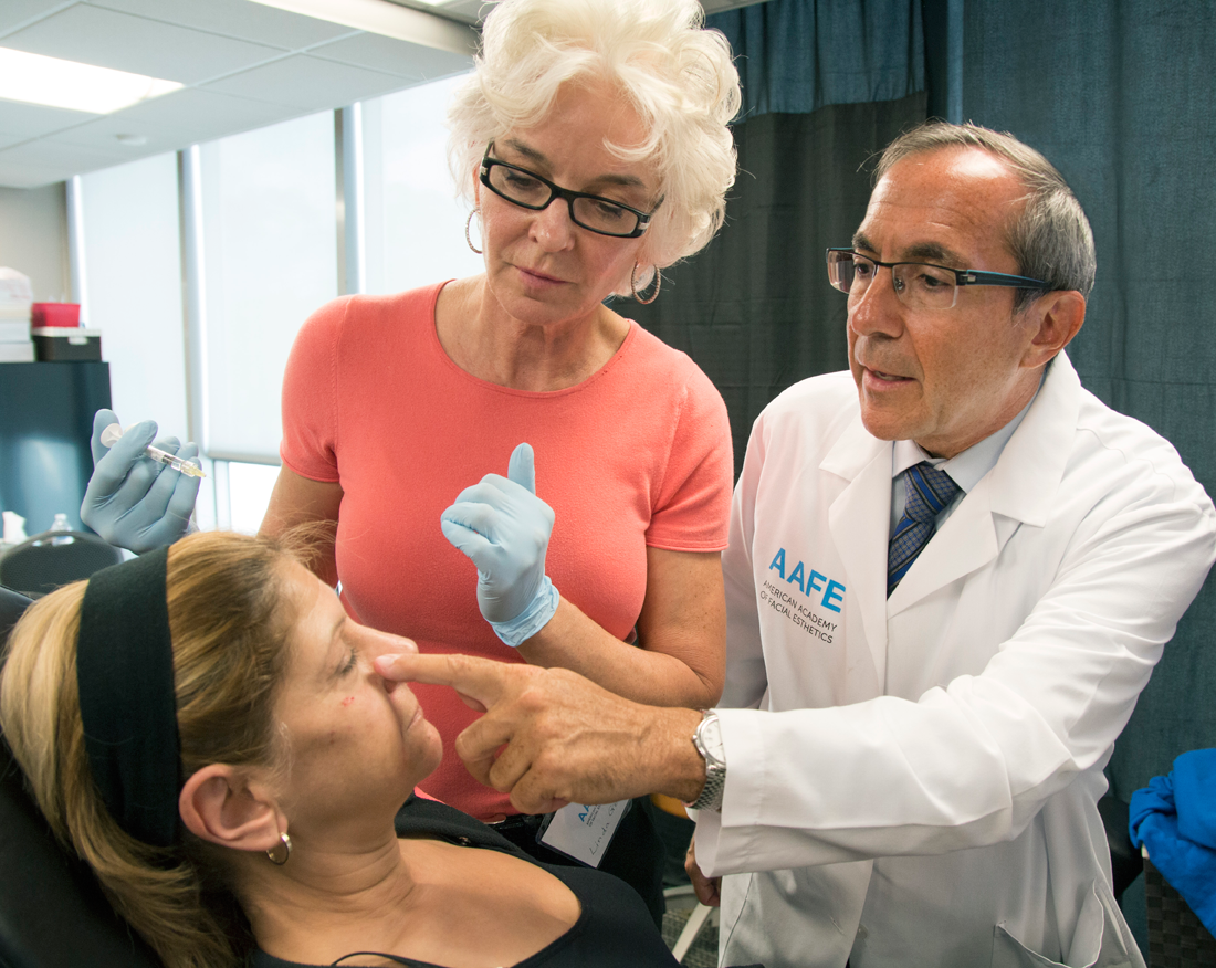 AAFE president Dr. Louis Malcmacher helps an attendee at a live patient training course.