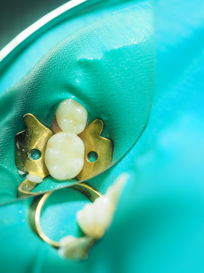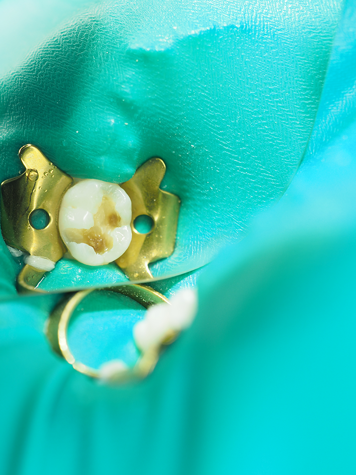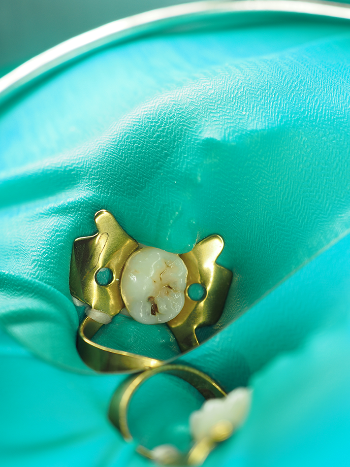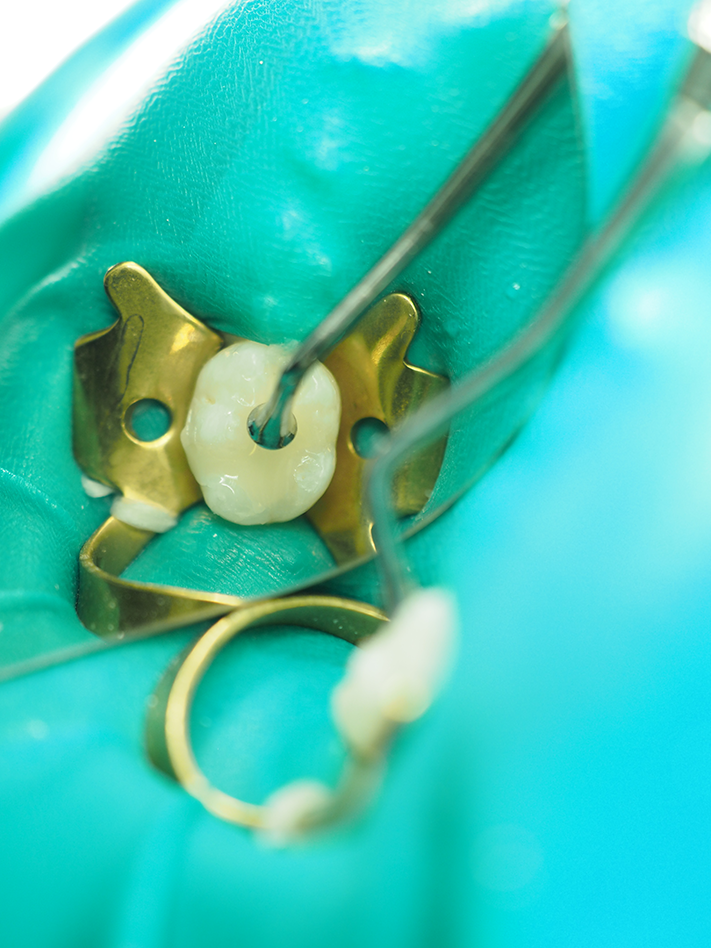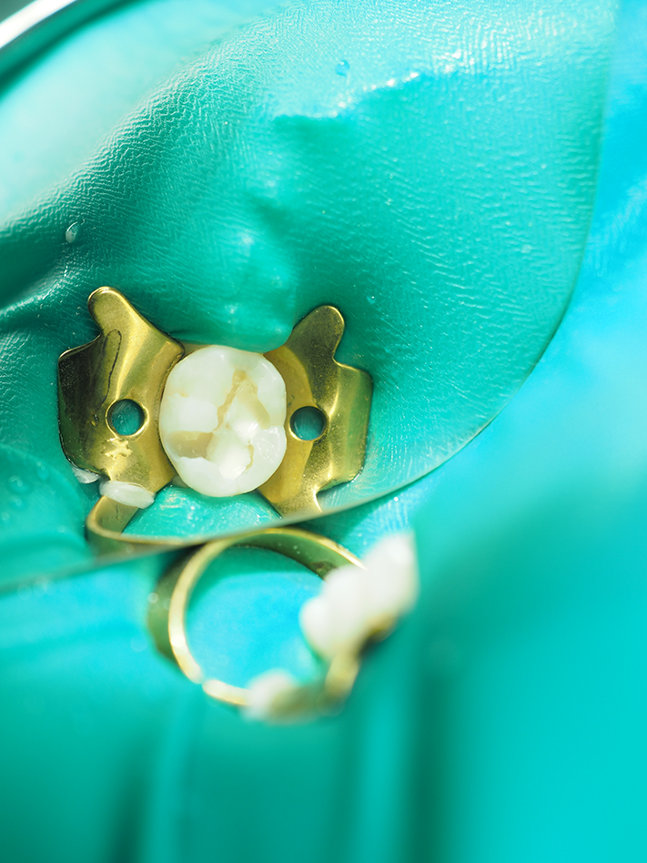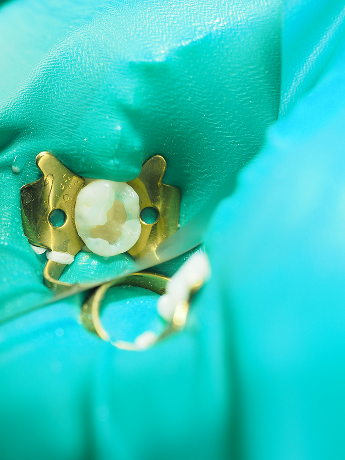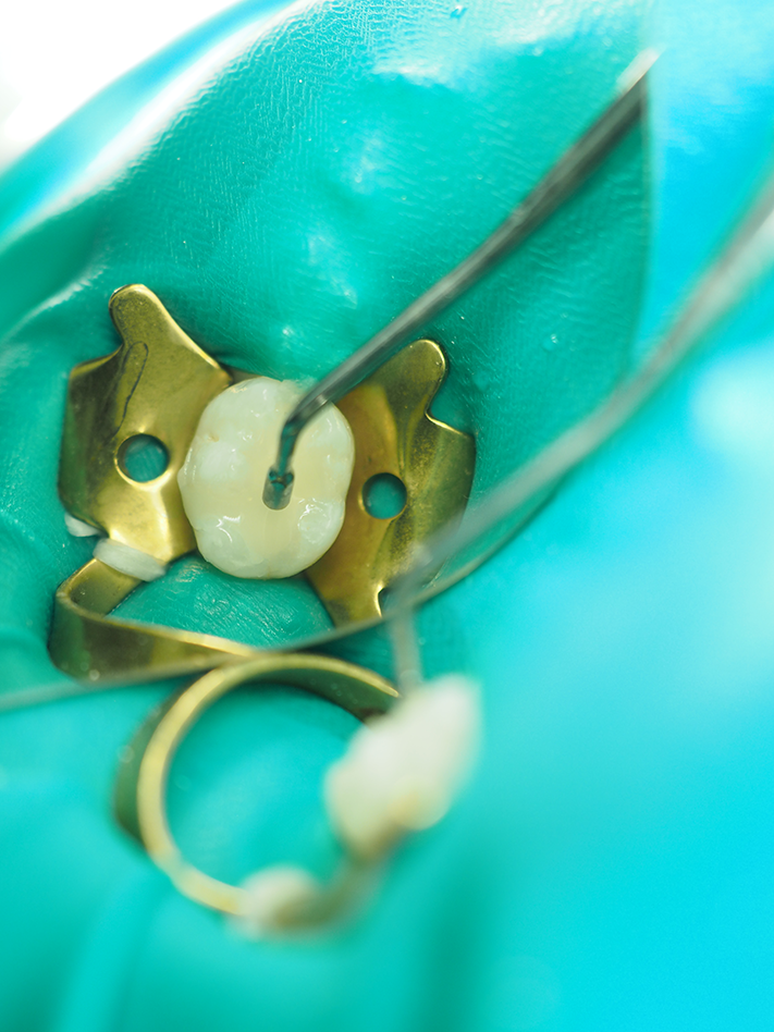 A #4 rubber dam clamp was atraumatically placed and a nonlatex rubber dam applied (Fig. 1). The preparation was performed with a #330 carbide bur from Tri Hawk with copious water spray to reduce smear layer formation11 (Fig. 2). Deep dentin caries was removed with a #4 round bur and a sharp spoon excavator, removing infected but leaving affected dentin (Fig. 3).