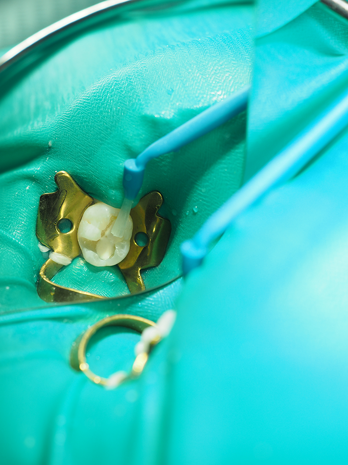 The preparation was etched with the enamel treated for 30 seconds, and then the etchant was rubbed onto the dentin for two to three seconds to remove the smear layer (Fig. 4). The etchant was then rinsed off for 10-15 seconds, leaving the enamel etched and the smear layer removed but with the dentinal plugs remaining (to reduce sensitivity). A resin-based tricalcium silicate base was then placed and light cured for 20 seconds (Figs. 5 and 6).