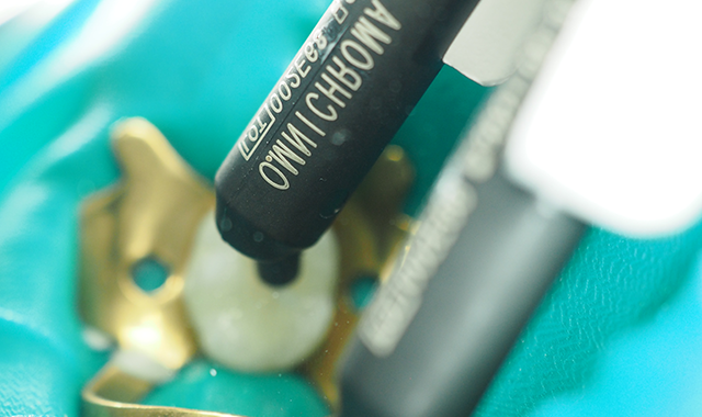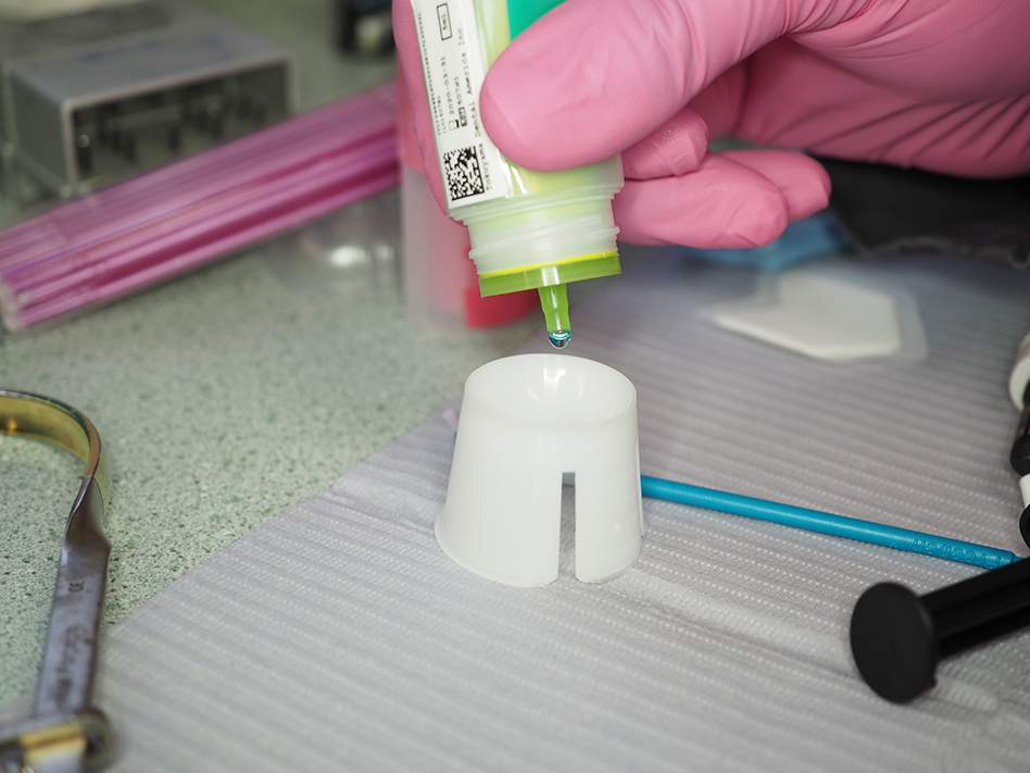 Following the light curing, a universal dentin bonding adhesive was gently applied to the preparation and then moderately air dried, taking approximately 25 seconds. Tokuyama Universal Bond from Tokuyama Dental America, an eighth-generation adhesive, is a self-etching adhesive that doesn’t require light polymerization (Figs. 7 and 8).