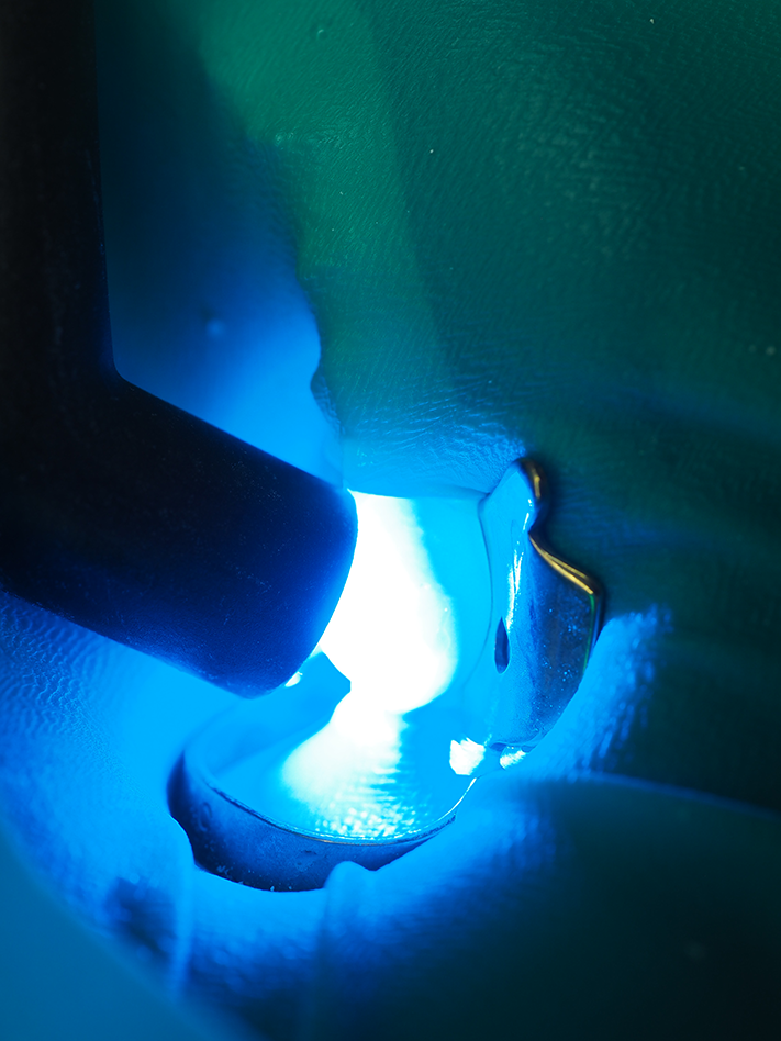 Polishing was accomplished with the RAPTOR® bur system from BISCO and Rally rubber points from Garrison Dental. After rubber dam removal, the occlusion was adjusted with a “football”-shaped gold carbide bur, and the restoration was “power cured” to harden the final surface (Figs. 12 and 13).