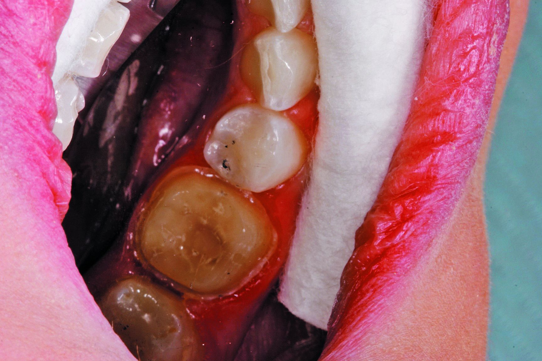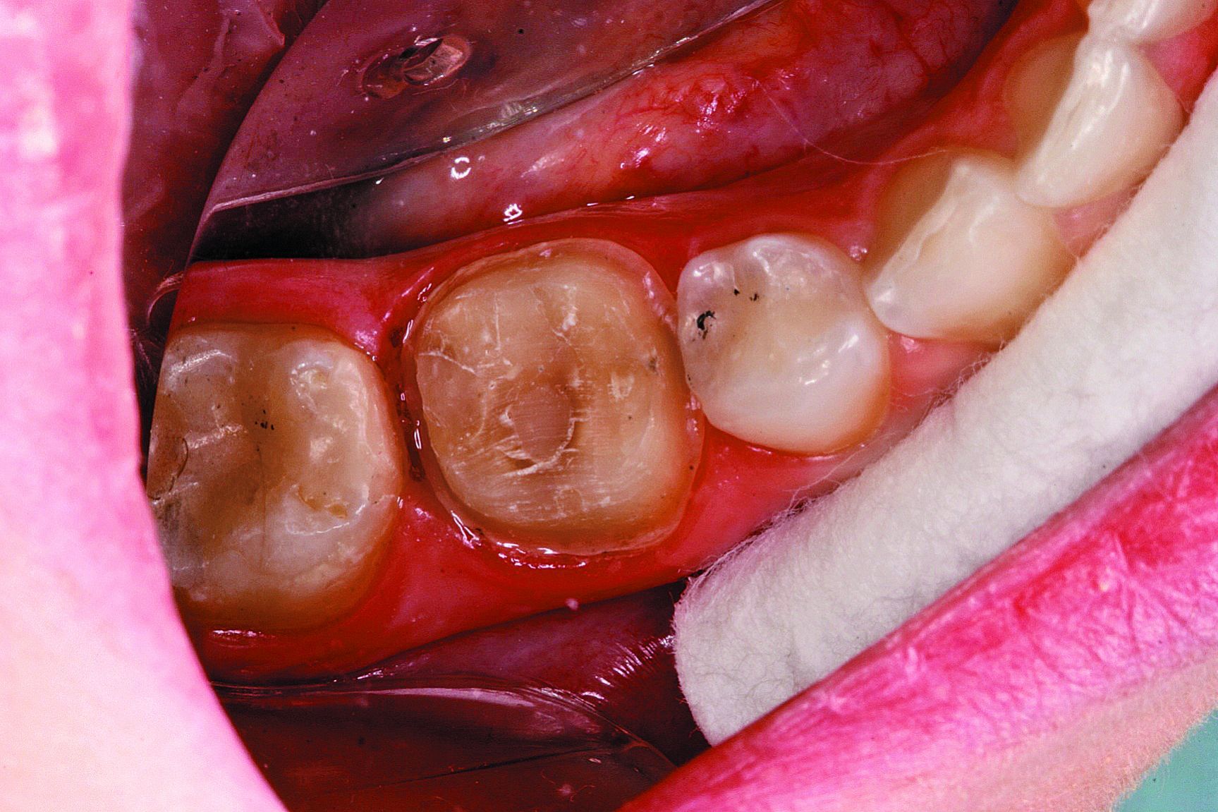 Step 1: The patient presented with decay on tooth Nos. 29 and 30. Decay was removed and the teeth were prepared for composite restorations.