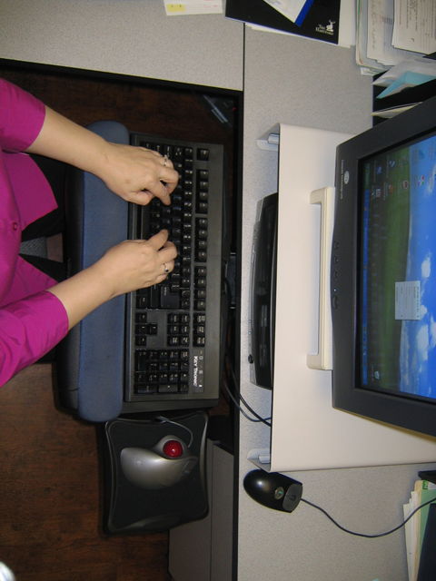 Unlike the dental patient chair, the height of the front office counter or desk is usually non-adjustable. Working with the keyboard positioned too high results in similar pain patterns seen among dentists who position their patients too high. Pain, tightness and trigger points develop in the upper trapezius (neck and shoulders). Make sure your keyboard height facilitates a position where the forearm is level or sloping slightly downward. The angle of the keyboard should facilitate a straight, or neutral, wrist posture when viewed from the side. Inclined keyboard trays attached under countertops and allow for a slight downward sloping of the keyboard, which frequently solves both keyboard height problems and wrist angle problems.
