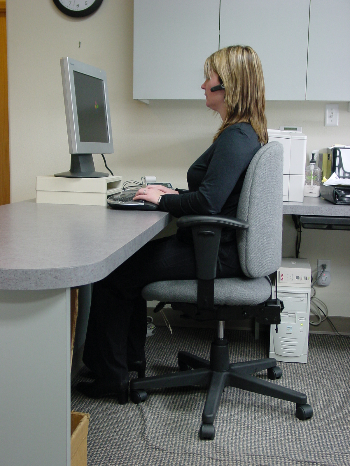 Due to an inherent need to see incoming patients, monitors are often placed to one side of the keyboard, causing the front office executive to work with the head turned to one side. Combine this with the ‘phone shoulder holder’ habit (Fig. 1) and you have a recipe for a musculoskeletal disaster. In this case, intervention is not an option, it is a must! Make sure monitors are always placed directly behind the keyboard. If space is a consideration, it may be time to upgrade to a flat-screen monitor.