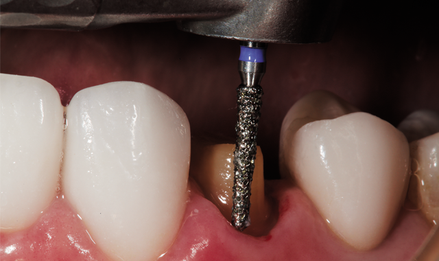 For conventional cementation, high-strength ceramics generally require the same amount of tooth reduction as traditional porcelain-fused-to-metal crowns. Generally, 1.5 to 2.0 mm of space is recommended for occlusal and incisal clearance so these crown materials can perform well in high-stress functional areas without the risk of fracture. Furthermore, rapid, efficient tooth reduction minimizes biologic trauma to the tooth and dental pulp during the preparation process.