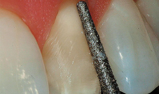 With a football-shaped diamond (5379.FG.023), eliminate the depth groove in the lingual concavity only (middle and incisal one-thirds of the lingual surface) (Fig. 12).
