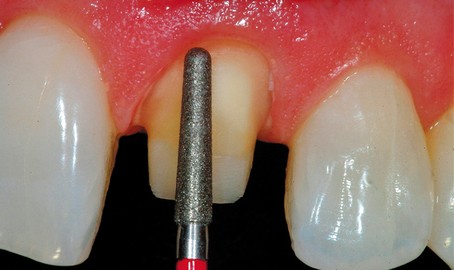Cut a depth groove by applying the 856XC.FG.016 rounded-cylinder diamond on the lingual surface, taking care to follow the natural contour of the tooth. The cervical plane formed by preparation of the cingulum should diverge 10 to 15 degrees from the cervical plane on the labial surface (Fig. 11).
