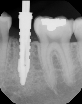 When the guide arrived, Yari was working in the office, so between her filing insurance claims for patients and checking in patients, she became my “next” appointment.During the implant placement, I captured several intraoral radiographs to verify the placement of the implant (Fig. 9). Using the guide offered precision placement. I placed the implant in 15 minutes, and she went back to work. To restore, I covered the screw hole with Grandio A2 (VOCO); a screw-retained crown (ProEsthetic Lab) was placed (Fig. 10).