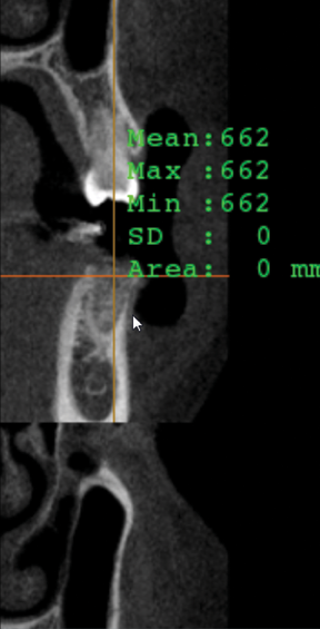 I started with the capture of a post-extraction i-CAT CBCT scan (Fig. 4), focusing in on the area of interest. I reviewed the implant site carefully and also used the Hounsfield tool in Tx STUDIO to assess the density of the area, which was 662 HU (Fig. 5).