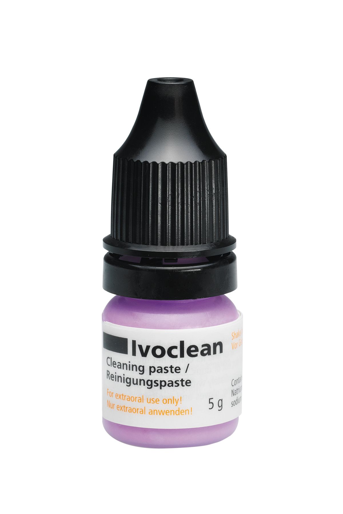 Ivoclean effectively cleans the bonding surface of prosthetic restorations after intraoral try-in to help create optimum pre-requisites for the adhesive luting procedure. The cleaning paste provides for effectively cleaning saliva-contaminated bonding surfaces of restorations and its universal indication makes it possible for use in dental restorative materials including glass ceramics, zirconium oxide ceramics, aluminum oxide ceramics, precious metal alloys, base metal alloys and lab-fabricated composite restorations. Its easy application significantly speeds up the cementation and seating process, resulting in less chair time.