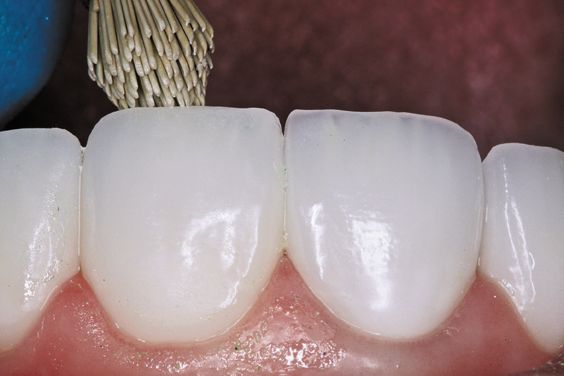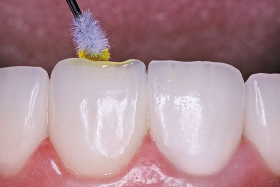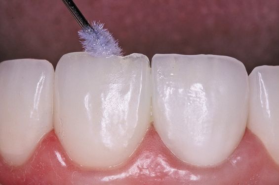 2. A 9% hydrofluoric acid porcelain etchant (Ultradent Porcelain Etch) is applied to the porcelain veneer (Fig. 3b).