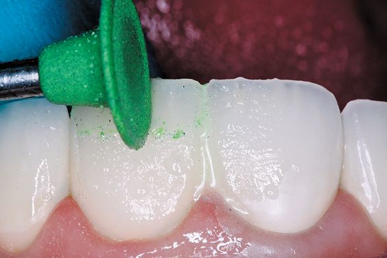 Each bur is used to achieve a high gloss finish (green course, yellow medium, white fine) (Figs. 8a-c).