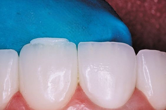 4. Bonding resin is placed on the restoration iBond (Heraeus), lightly air dried and cured (Fig. 5). Venus Diamond composite B1 body shade from Heraeus was used.