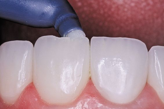 1. The fractured porcelain veneer is air-abraded using aluminum oxide to increase micromechanical retention with the abrasion unit. Restoration was rinsed and dried (Figs. 2 and 3a).