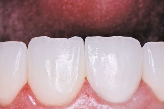 Composite resin is frequently indicated for bonding, filling cavities, repairing fractures in crowns, onlays, bridges, and in the case presented here, repairing fractured porcelain veneers. It is important in the anterior region to match natural dentition in color and anatomic form, which composite resin easily achieves.² This is because available composite materials offer a variety of opaque and translucent shades, are extremely pliable, very resilient, and capable of being shaped or thinned using only a stream of air. Composite resin also possesses beneficial caries-inhibiting properties and increases the overall durability of restorations.